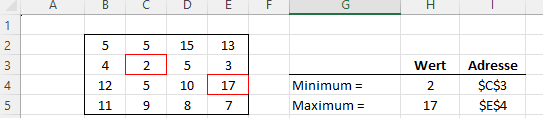 =ADRESSE(@INDEX(ZEILE(B2:B5);SUMMENPRODUKT((B2:E5=H4)*(ZEILE(B2:E5)-1)));@INDEX(SPALTE(B2:E2);SUMMENPRODUKT((B2:E5=H4)*(SPALTE(B2:E5)-1)));1;1)